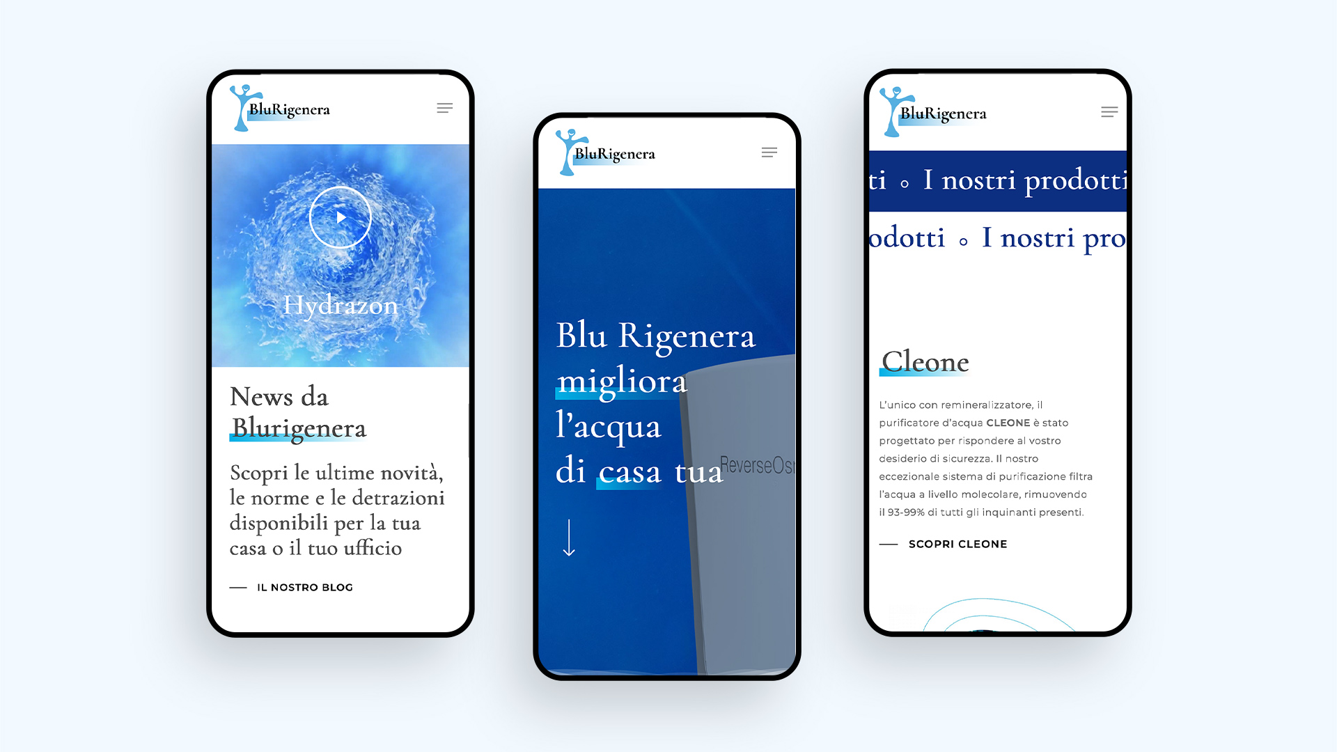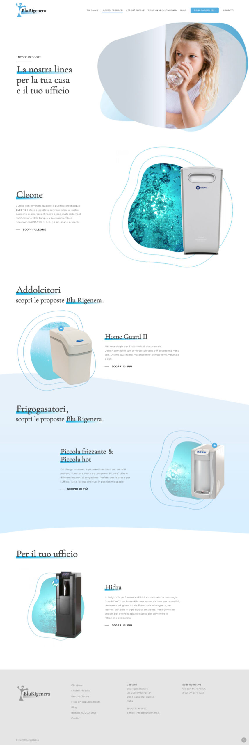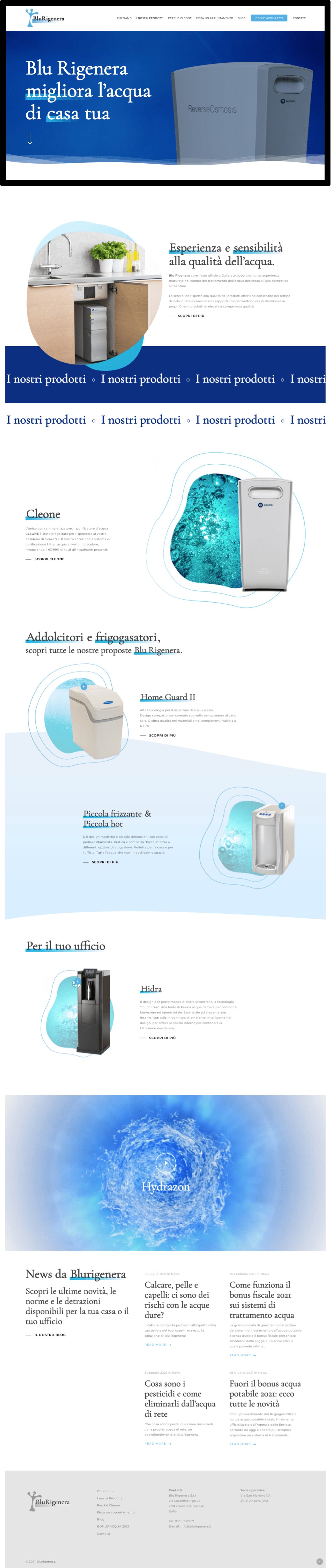 The images evokes the beauty of water and its feeling zooming in or looking closely at elements of the water itself. The Blurigenera products are then placed in this world clearly communicating all their features and technical details. To offer a proper shopping experience there is also a section featuring a questionnaire for users to share their habits regarding water consumption to then be advised on the best product.