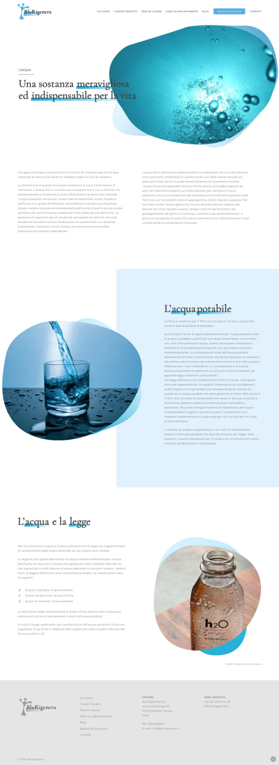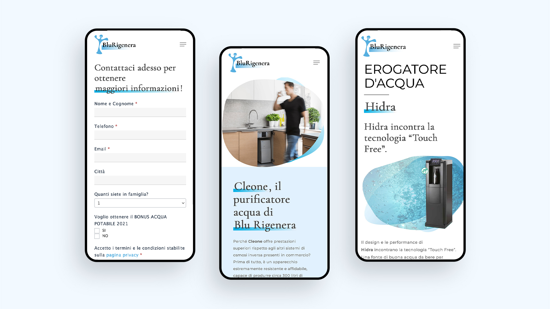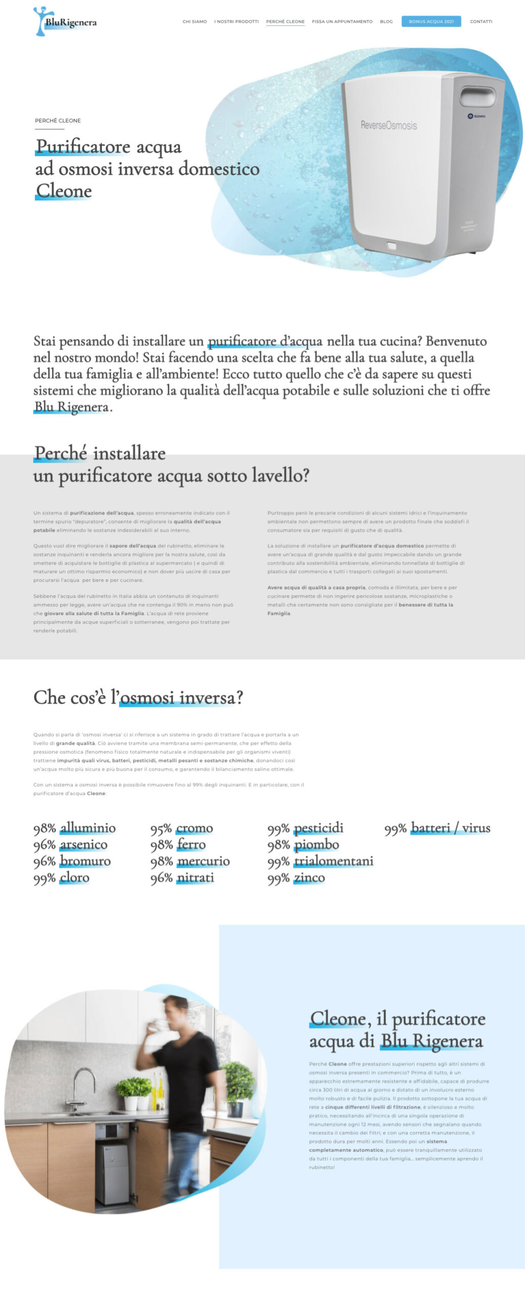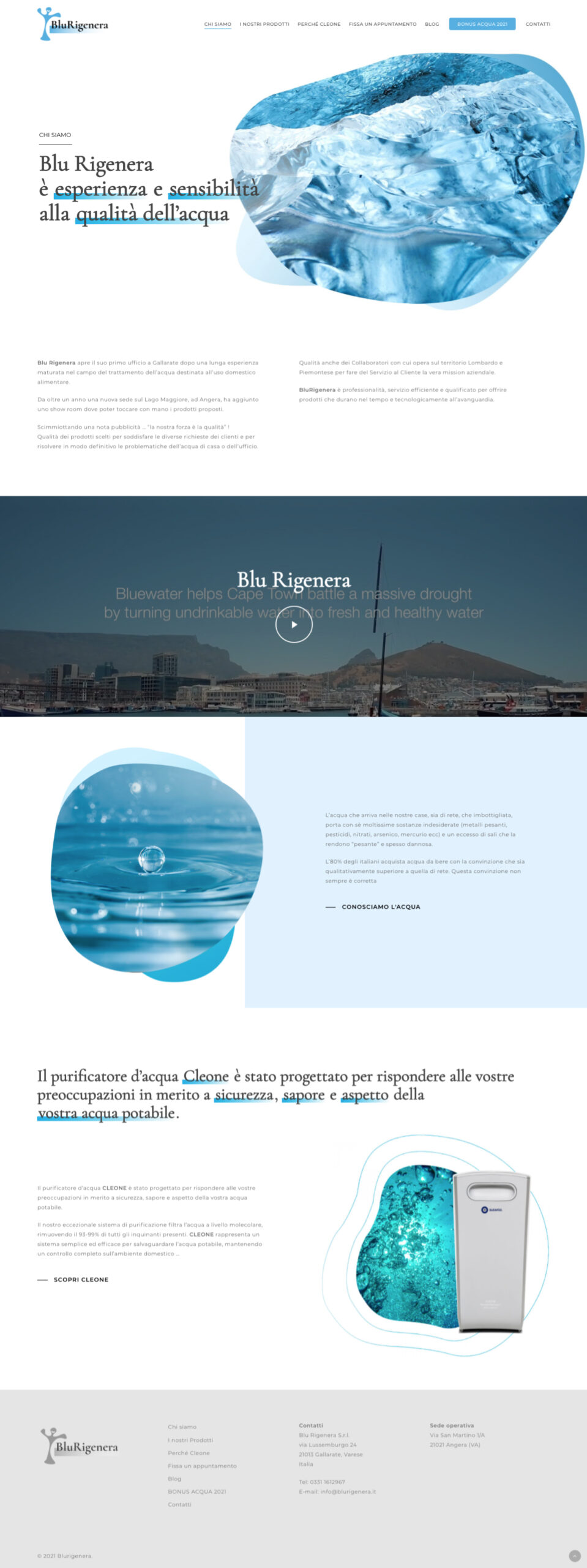 The images evokes the beauty of water and its feeling zooming in or looking closely at elements of the water itself. The Blurigenera products are then placed in this world clearly communicating all their features and technical details. To offer a proper shopping experience there is also a section featuring a questionnaire for users to share their habits regarding water consumption to then be advised on the best product.